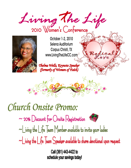 If so, ask your church to invite our Living the Life team during one of your events or church services and all onsite registrations will receive $5.00 off! Upon request, one of our Living the Life speakers can also share a personal invite and/or an encouraging word with your congregation or ladies. Please call Natalie at (361) 443-4422 and schedule your savings today!