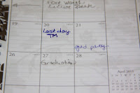 I instinctively wrote down Last Day TM. (TM is the school.) I’ve done this for years now – actually for a total of 18 years I’ve had children in school. There for a couple of years each of my three children were at different schools, thus me having to add the school names to clarify which school was getting out. Talk about crazy schedules???