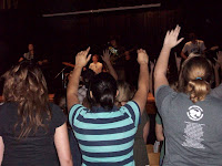 As the band began playing, people started standing all over the auditorium. (I think I cried first.) Then huge groups of youth headed for the front and lined up at the foot of the stage. Swaying back and forth with hands raised in the air these kids and adults were worshipping God. Amazing! The Spirit of God was alive and present in that assembly.